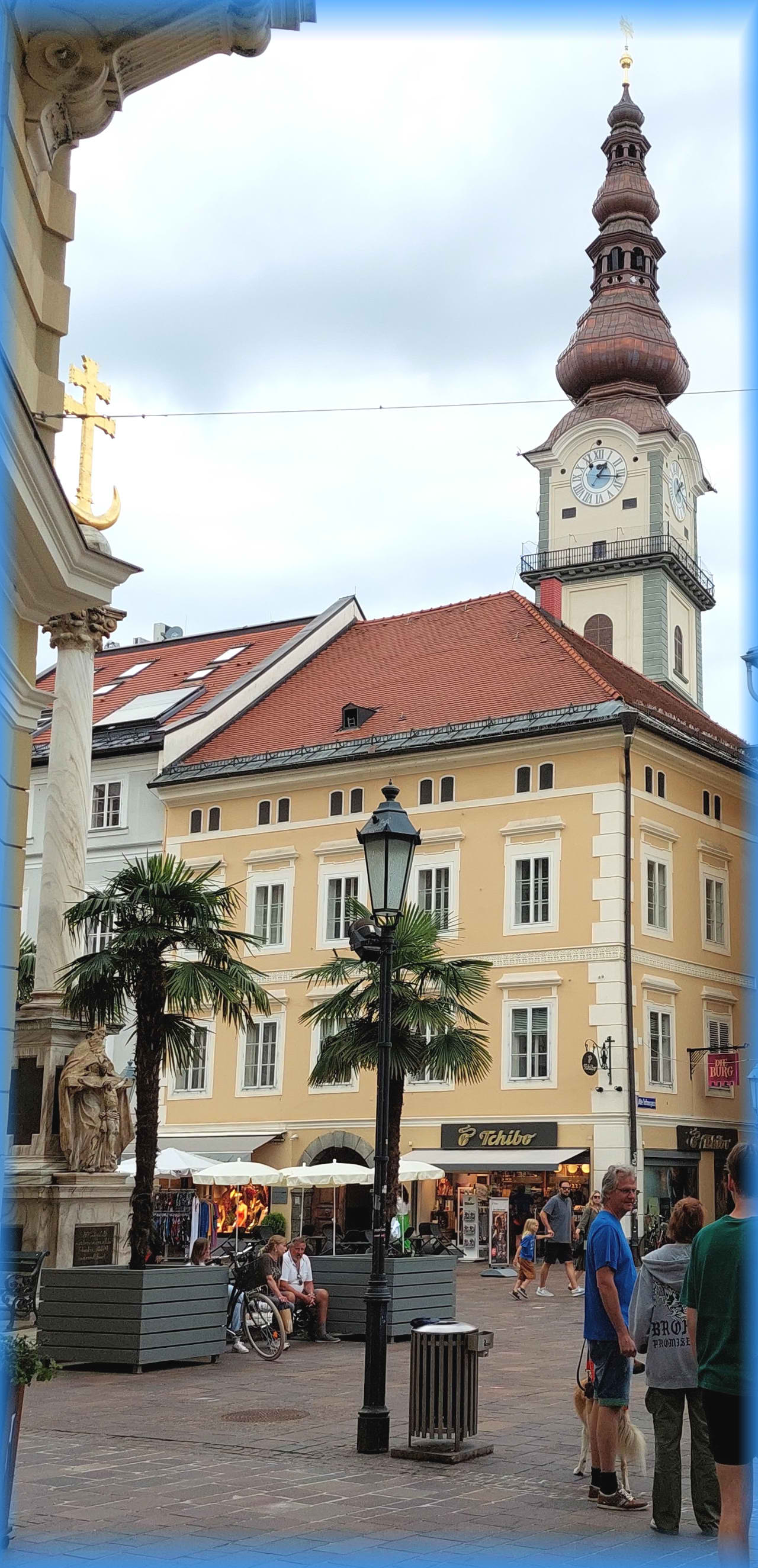 Unser nächster Halt ist die Landeshauptstadt von Kärnten, Klagenfurt am Wörthersee . Wir kommen gegen 11:45 Uhr an und parken günstig gelegen im Parkhaus der City Arkaden am Heuplatz. Das repräsentative Landhaus hat einen Grundriss der hufeisenförmig ist und ein steiles Satteldach es wurde 1574–1590 erbaut. Im Innenhof sind ein zweistöckiger Arkadengang sowie zwei schlanke Zwiebeltürme zu bewundern. |