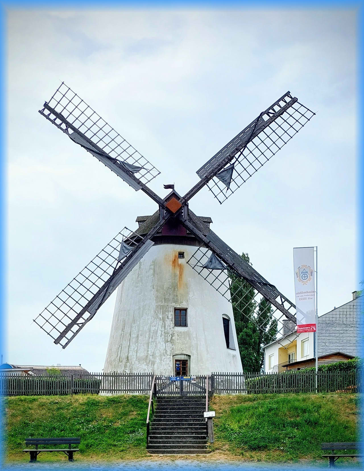 Die Windmühle in Podersdorf am See ist die letzte ihrer Art im Burgenland . |