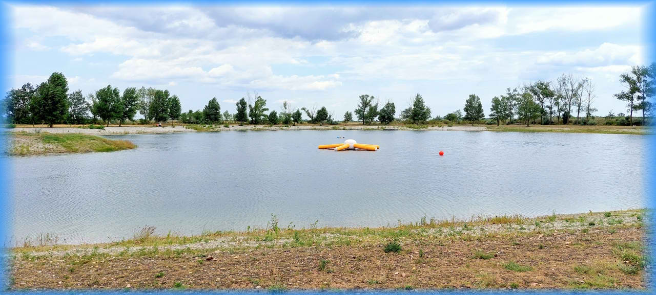 Er entstand aus einer Schottergrube und hat sehr klares Wasser zu bieten. Es gibt hier eine große Liegewiese mit schattigen Plätzen sowie einen Radweg , einen Volleyballplatz, einen Kinderspielplatz und man kann hier Tischtennis spielen. | |||
